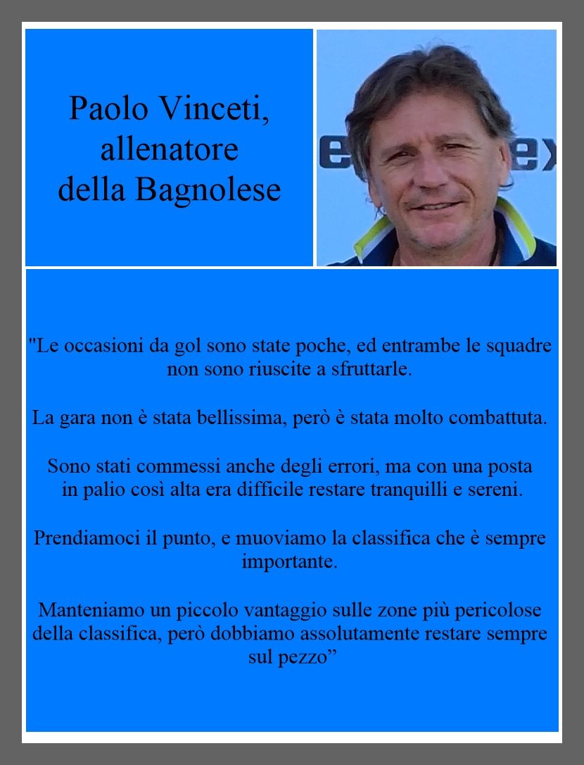 Le dichiarazioni di Paolo Vinceti, allenatore della Bagnolese, dopo la gara contro il Vezzano