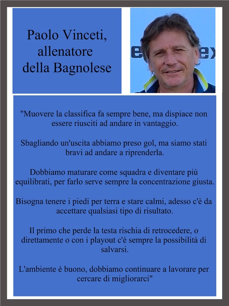 Le dichiarazioni di Paolo Vinceti, allenatore della Bagnolese, dopo la gara contro la Spes Borgotrebbia.