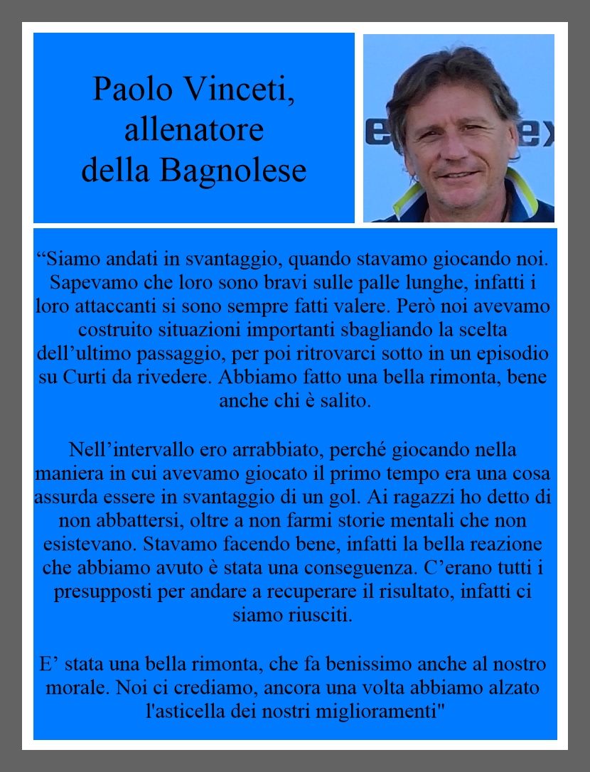 Le dichiarazioni di Paolo Vinceti, allenatore della Bagnolese, dopo la gara contro la Langhiranese Valparma